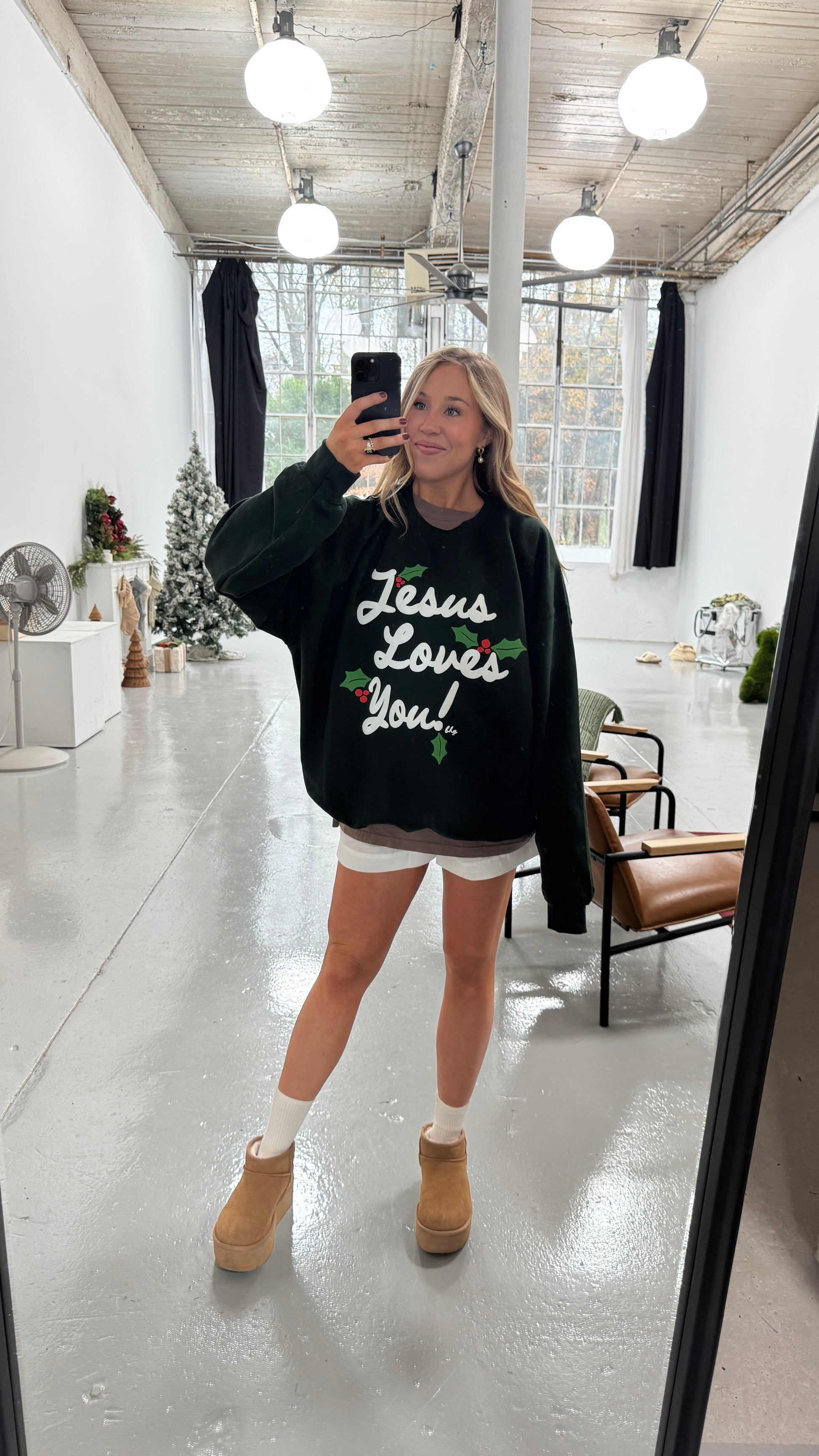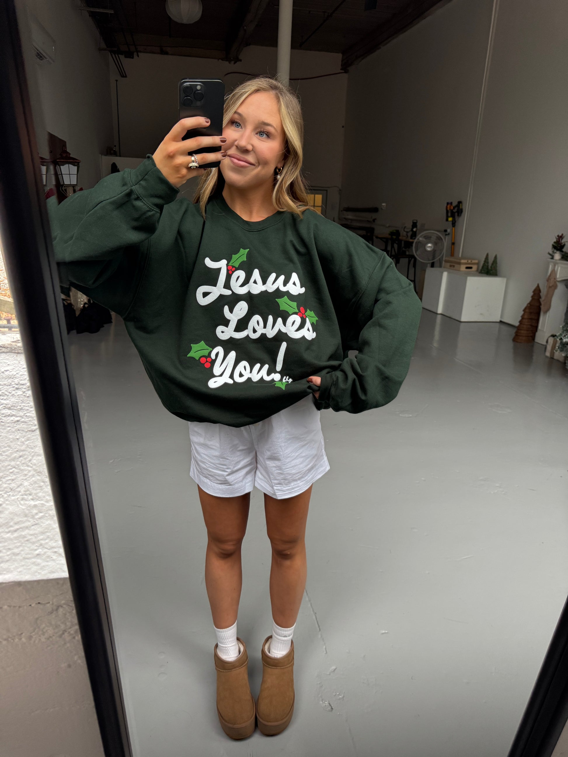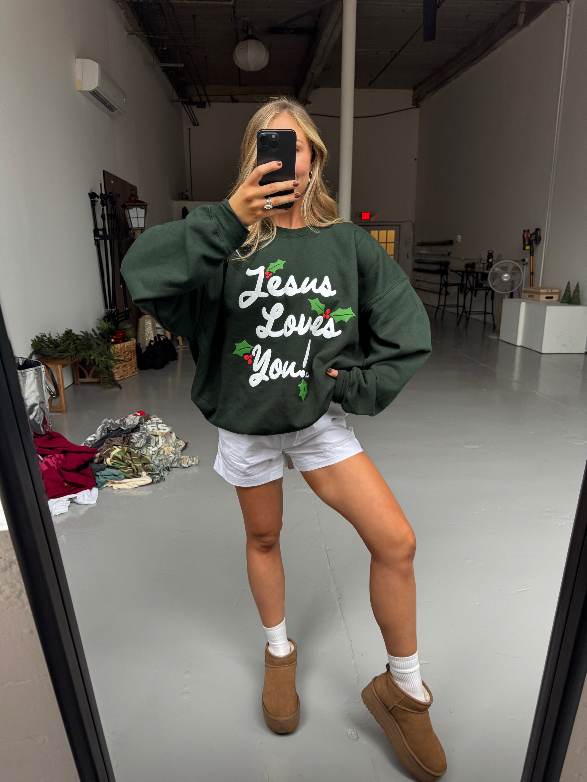 A Gildan unisex sweatshirt in a deep Frasier Fir forest green with multicolor screenprint 3D puff. These run TTS. I am wearing a 2XL for reference. Size up for oversized fit!