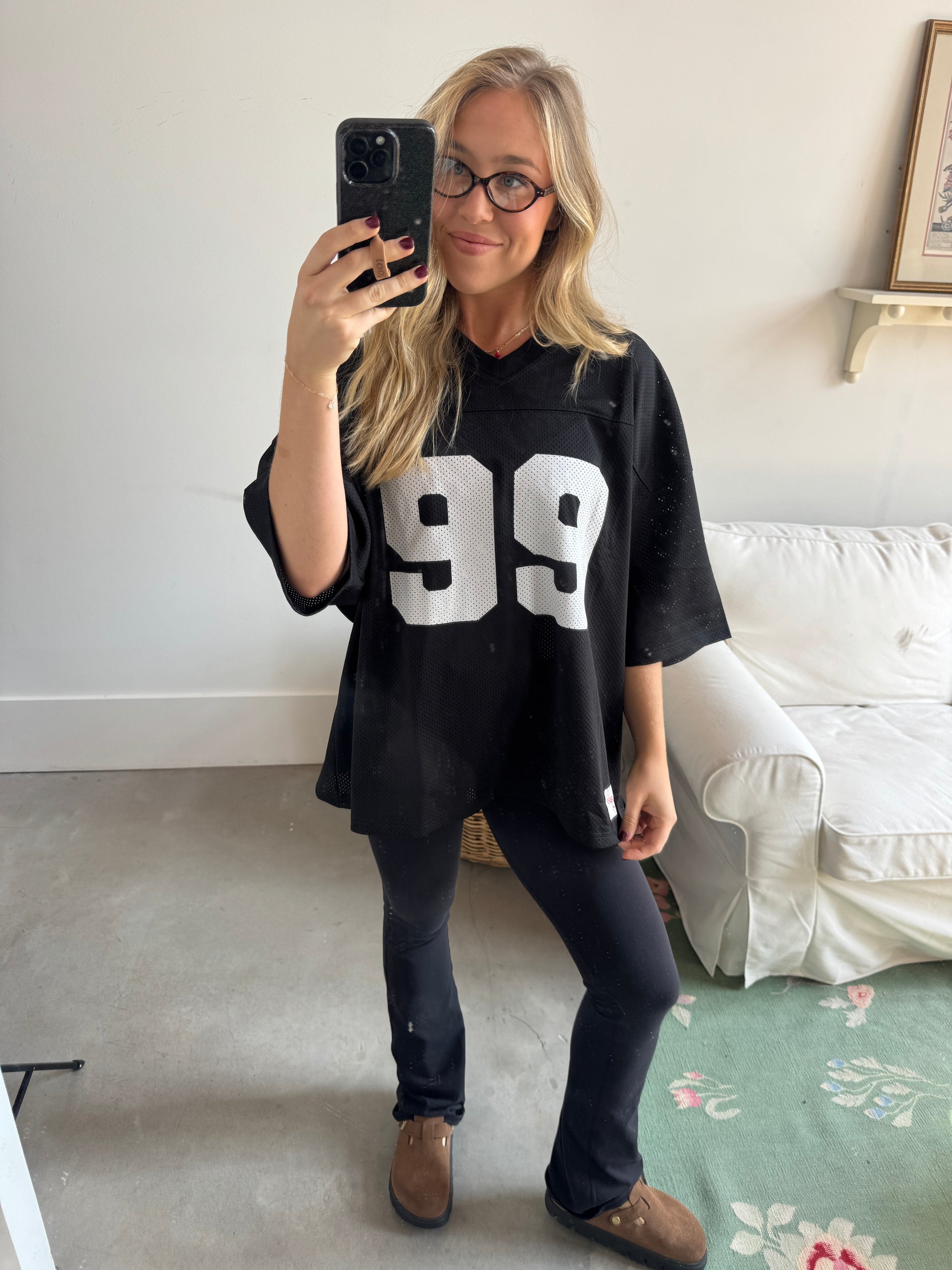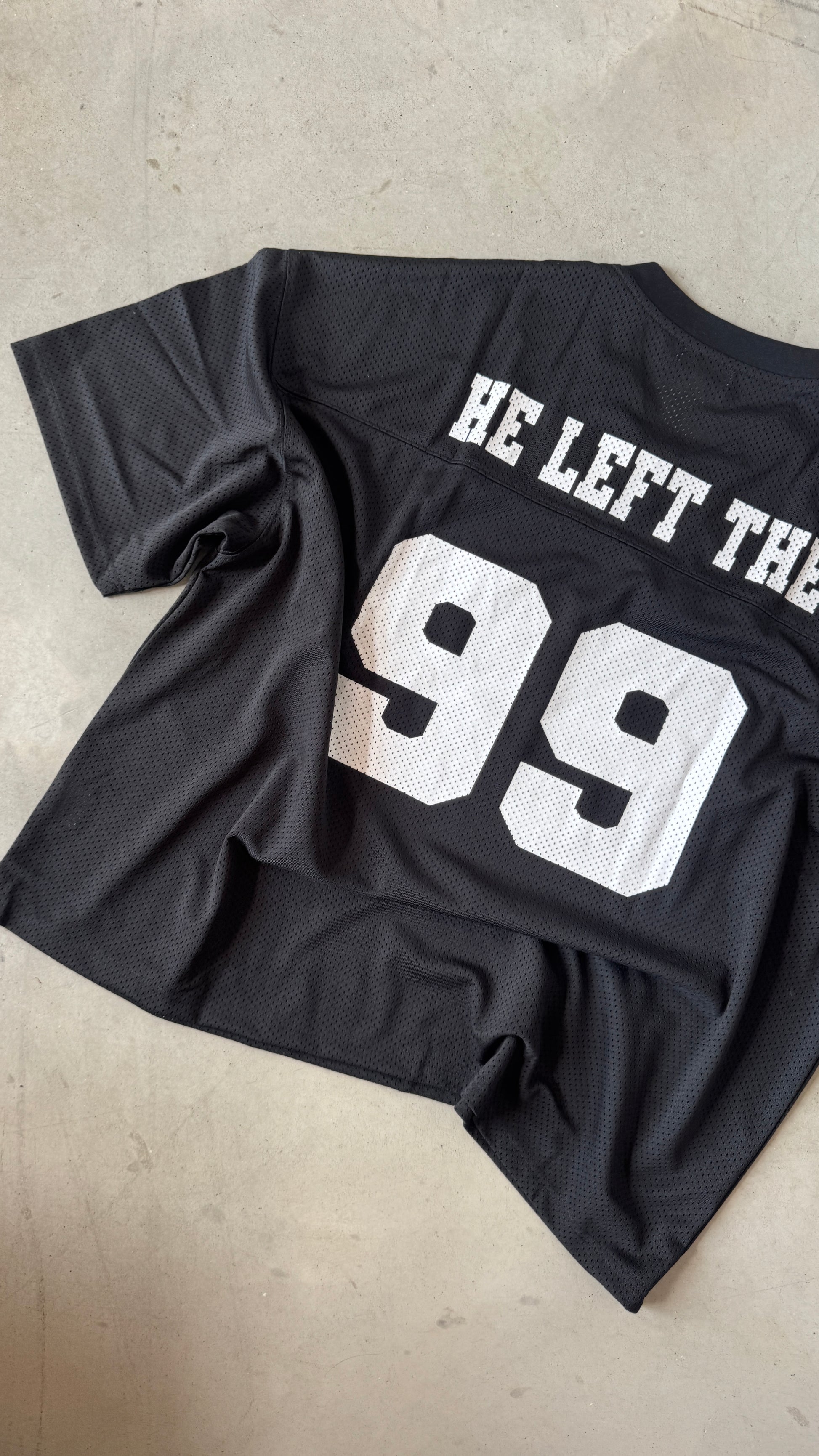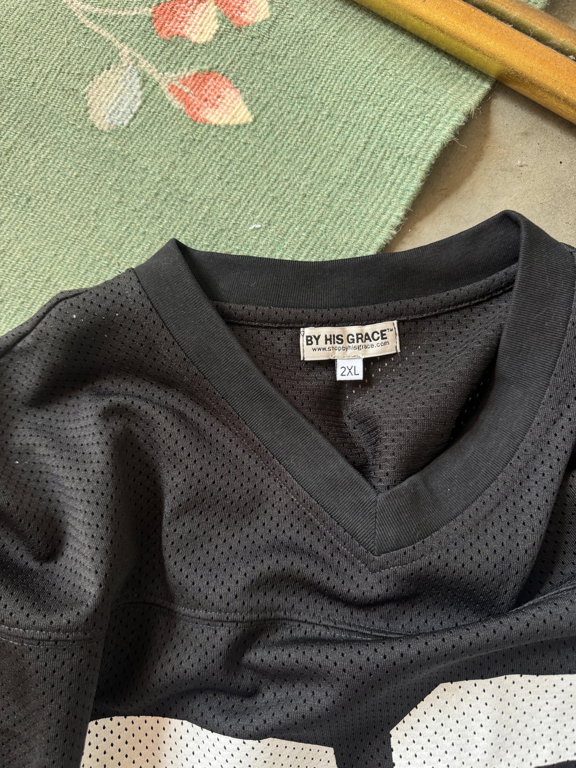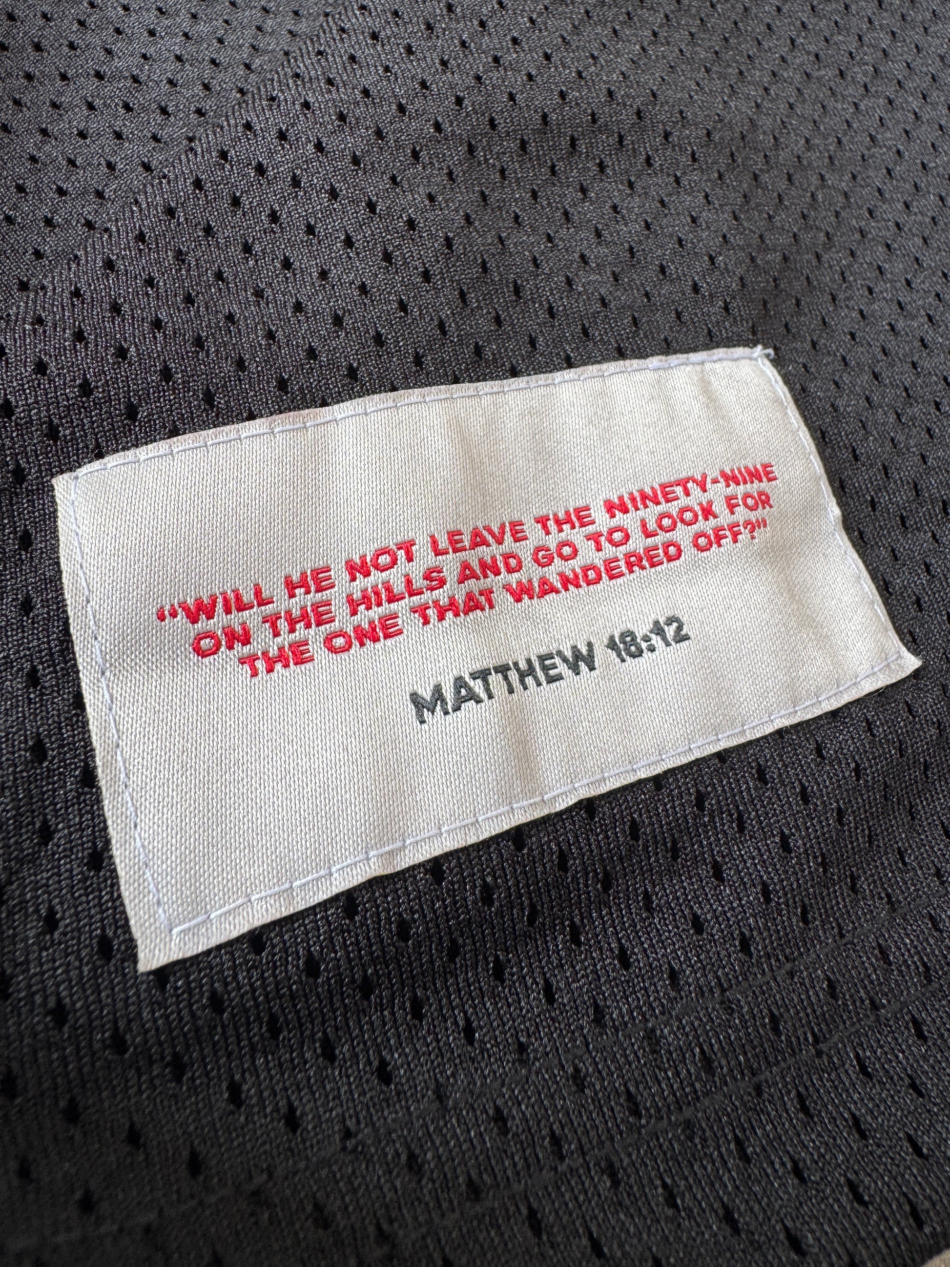 Introducing the first-ever, custom clothing piece for By His Grace. This custom mesh jersey features white screenprinting on the front and back, custom sewn in BHG neck tags and a sewn in stitched fabric square on the bottom left of the jersey that has Matthew 18:12 in red and black stitching. Traditional jersey v-neckline.
