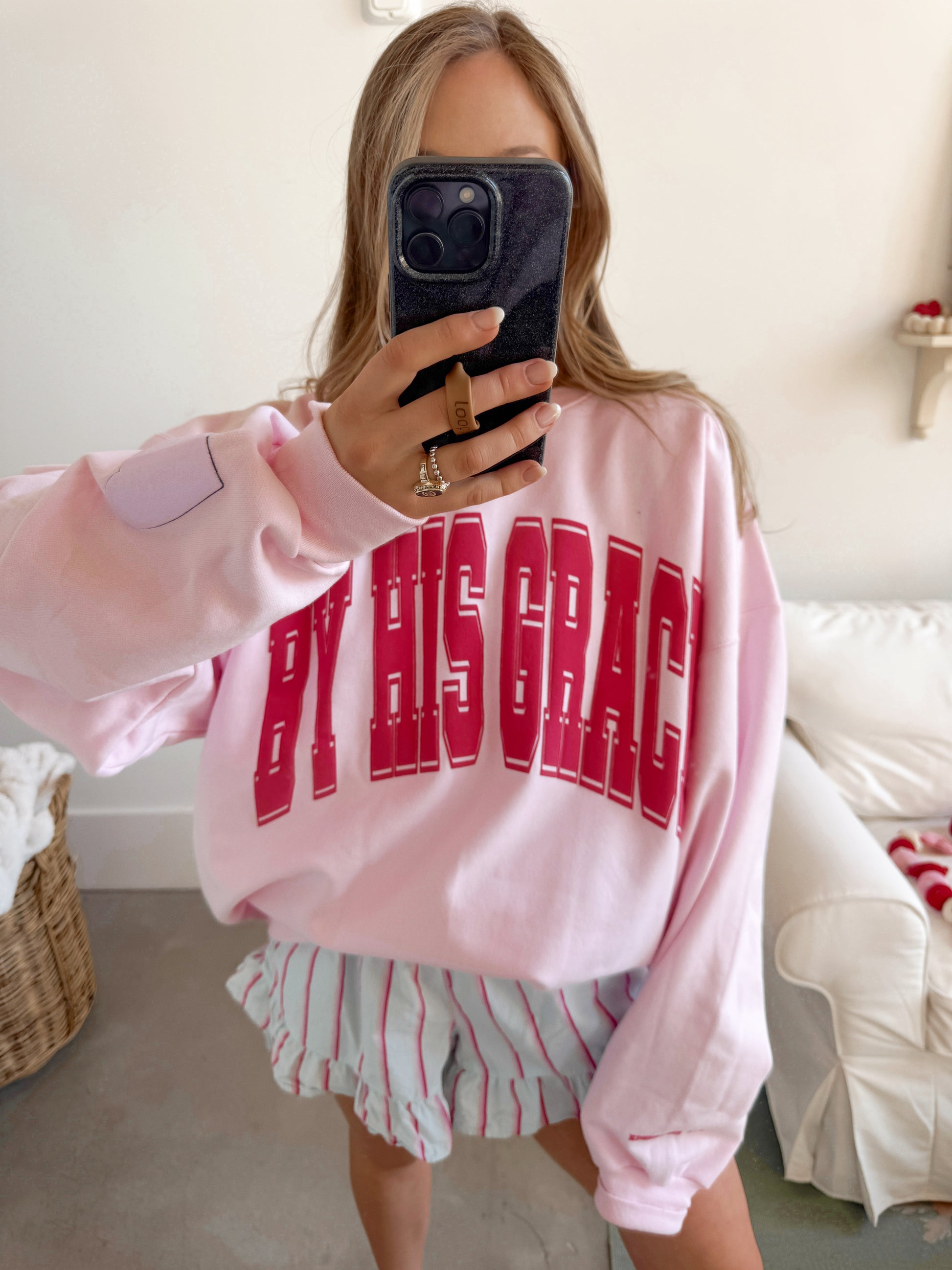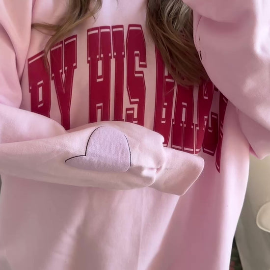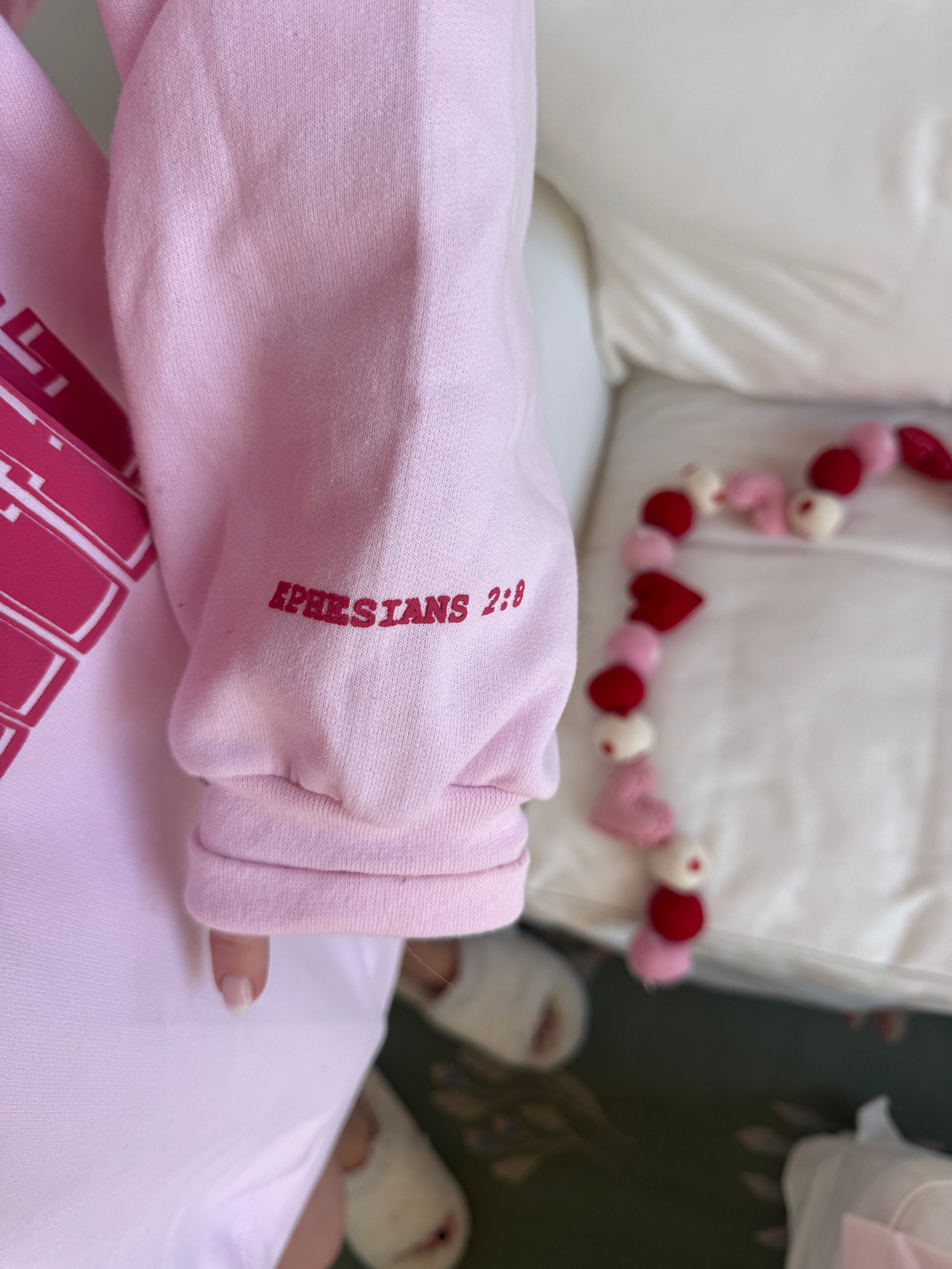 Hanes premium heavyweight 10oz pink pullover featuring a jumbo-sized cherry red arched puff print design on the front and two sleeve designs. Right sleeve has a light pink outlined puff heart. The left has a matching cherry red puff print line that reads "Ephesians 2:8".