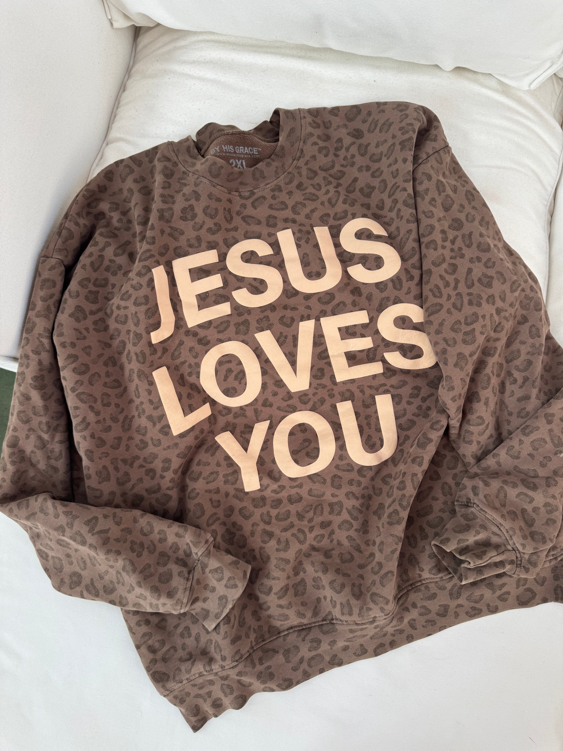 A premium 100% cotton crewneck from Cotton Collective in their Leopard print pattern. This is a drop-shoulder, luxury heavyweight 15oz crewneck with light brown screenprinted puff print in the arch JLY design.