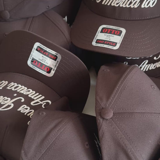 OTTO 5 panel brown canvas trucker hat with ivory cursive embroidery on the front and back. Adjustable snapback. Perfect for the fall/winter neutrals.