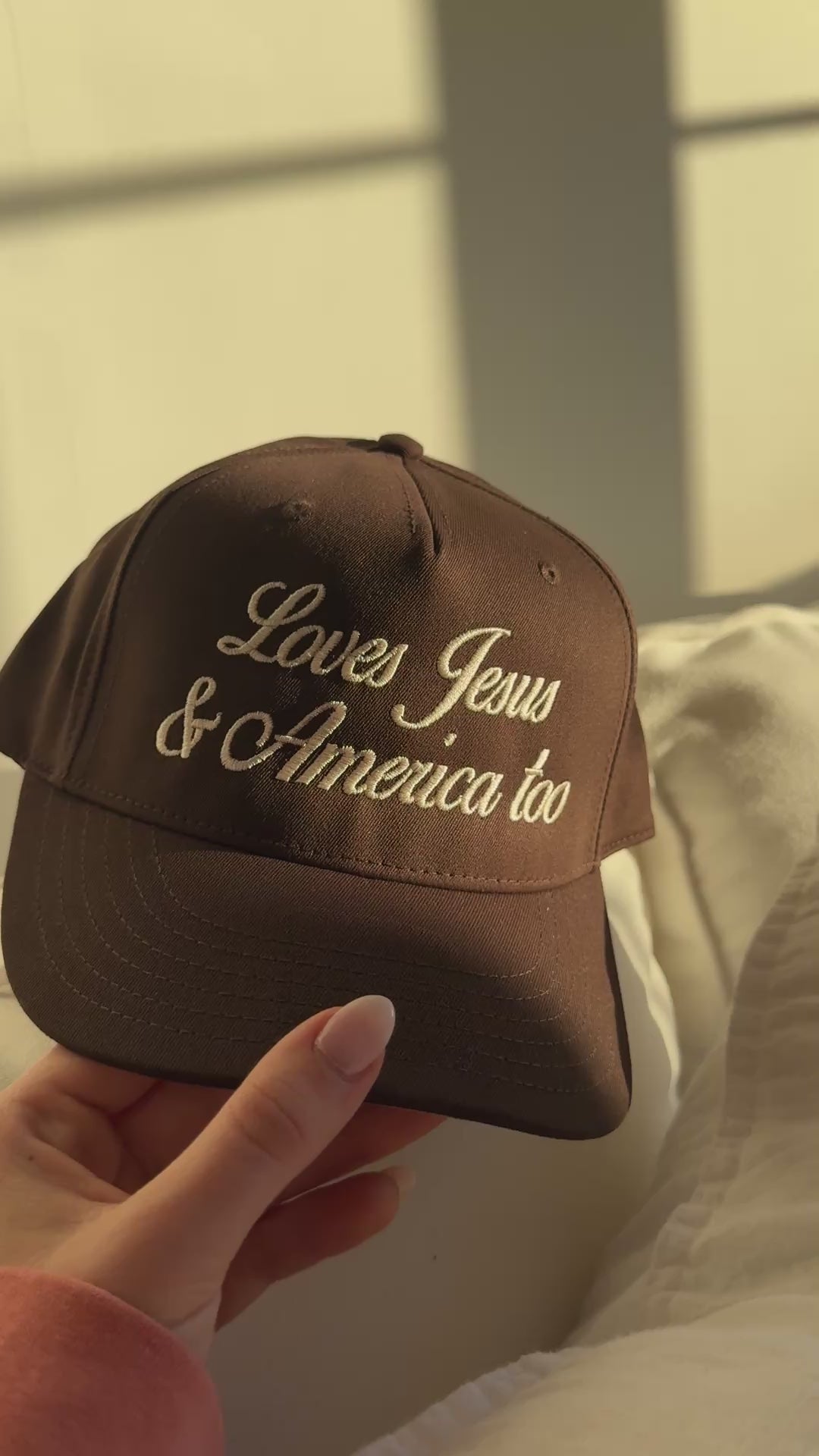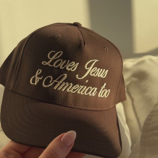 Loves Jesus & America Too Vintage Trucker Hat - Brown/Ivory