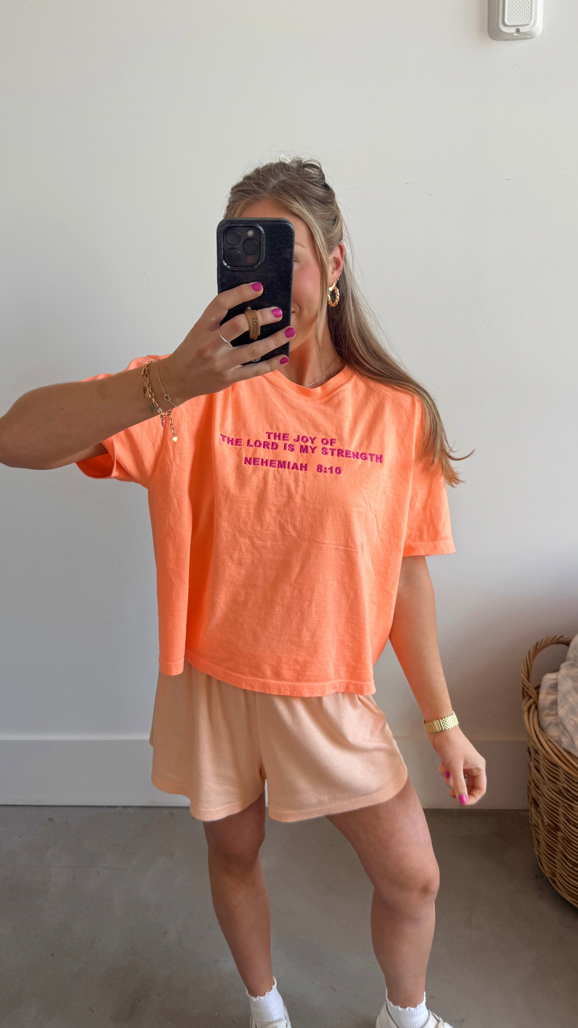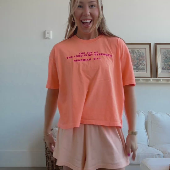 The Comfort Colors Heavyweight Women's Boxy Tee in Neon Cantaloupe with magenta embroidery on the front that has Nehemiah 8:10. "The joy of the Lord is my strength".