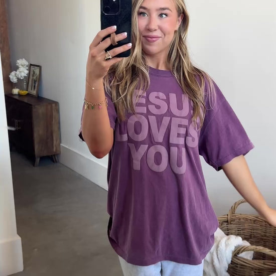 A Comfort Colors rich plum colored tee tone on tone puff print on the front. These run TTS and are unisex. Size up for oversized fit! I am wearing XL here for reference.