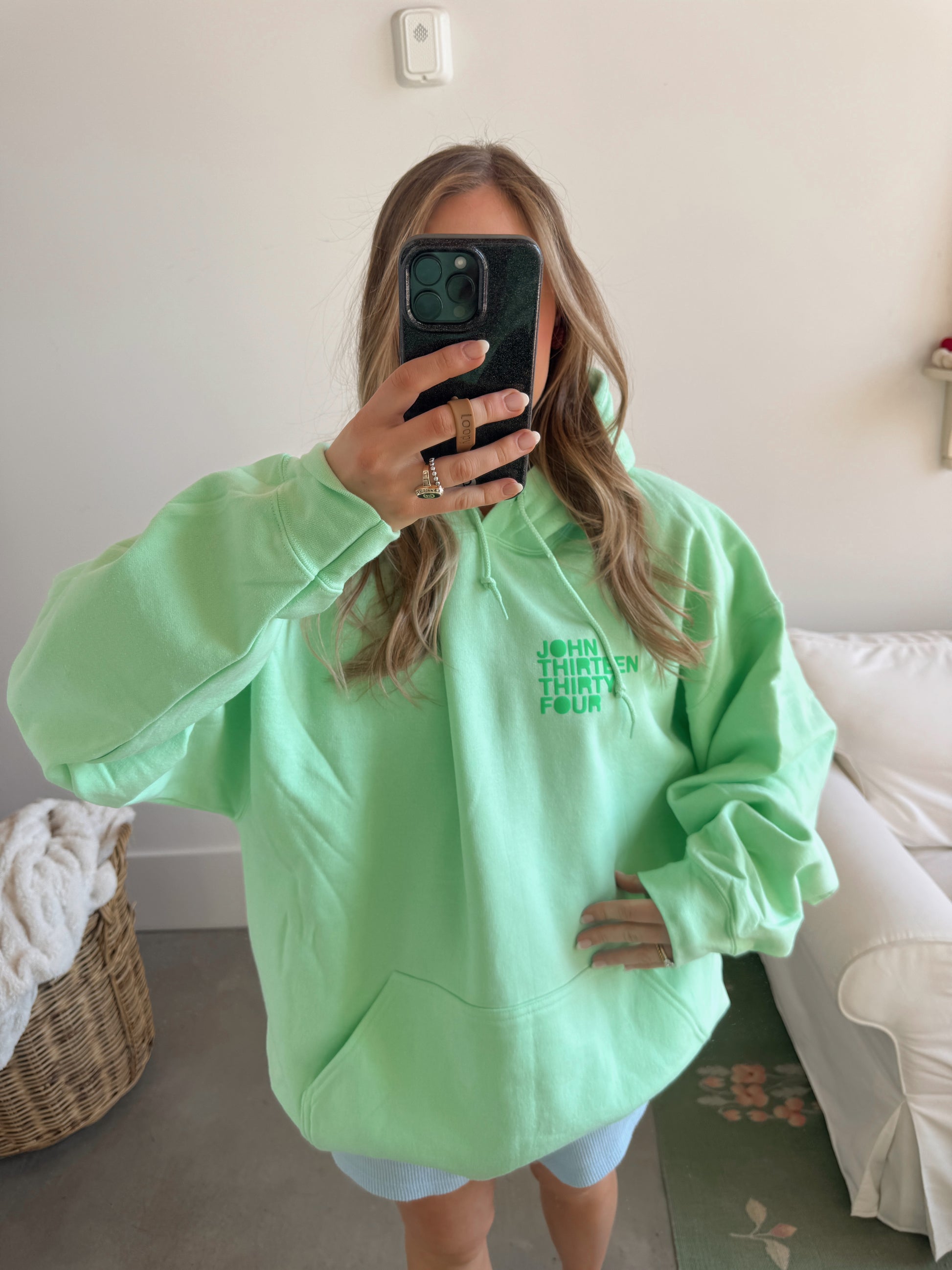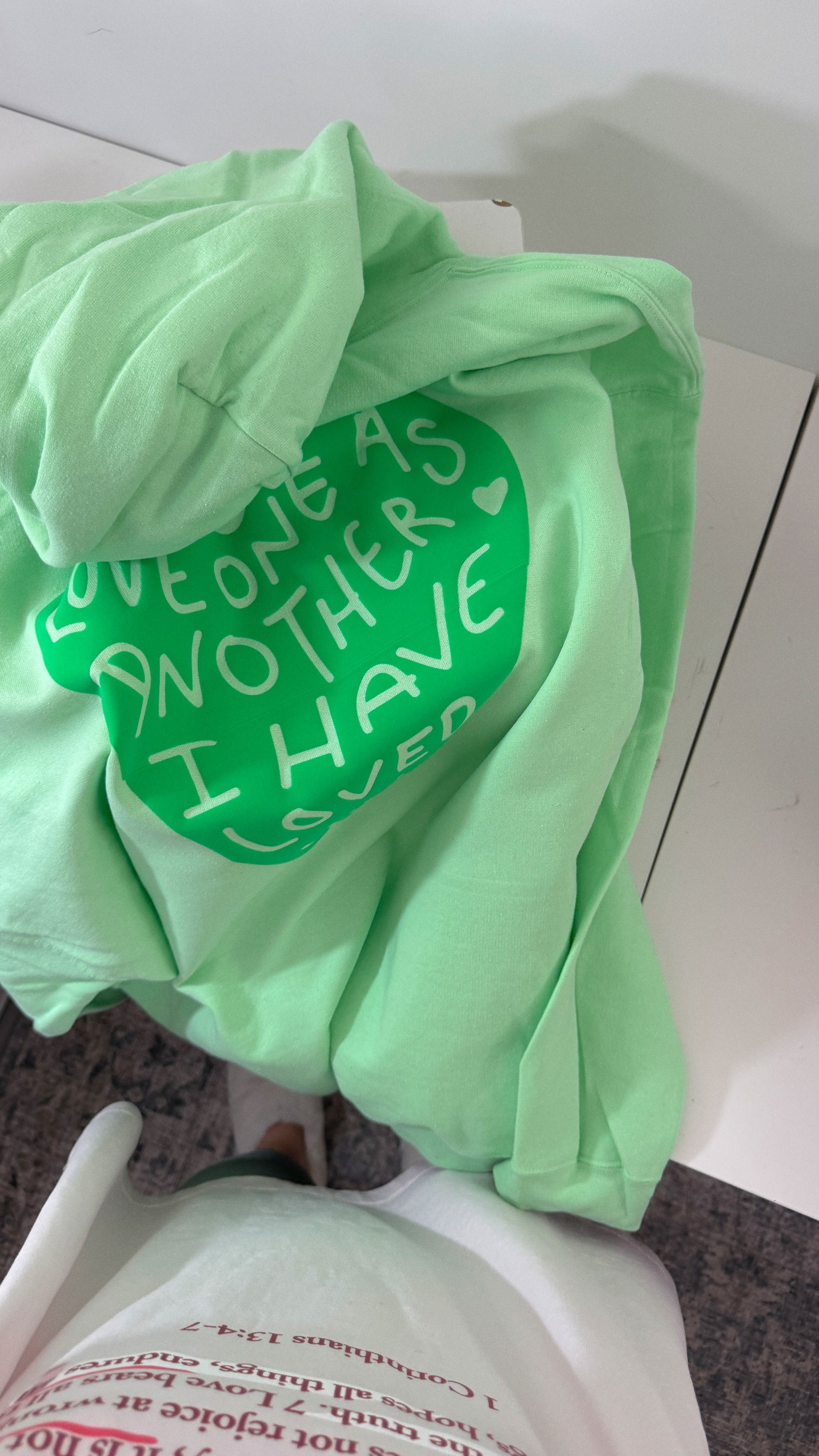 This these are unisex! Hand-pressed Gildan hoodie in mint green with neon green puff print vinyl on the front and back.